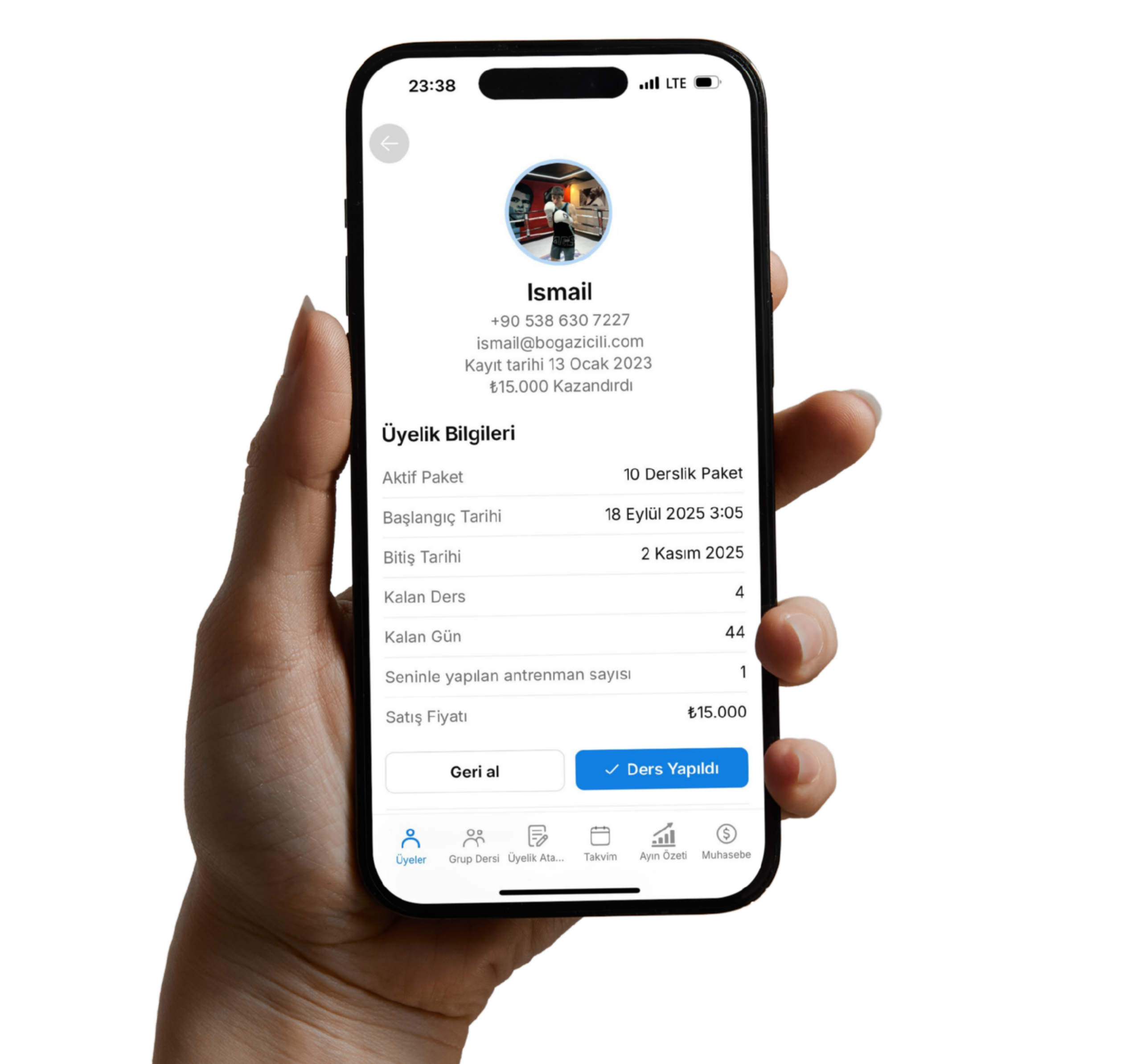 Üyeler paketlerini, ders geçmişlerini ve kalan haklarını kolayca takip eder.